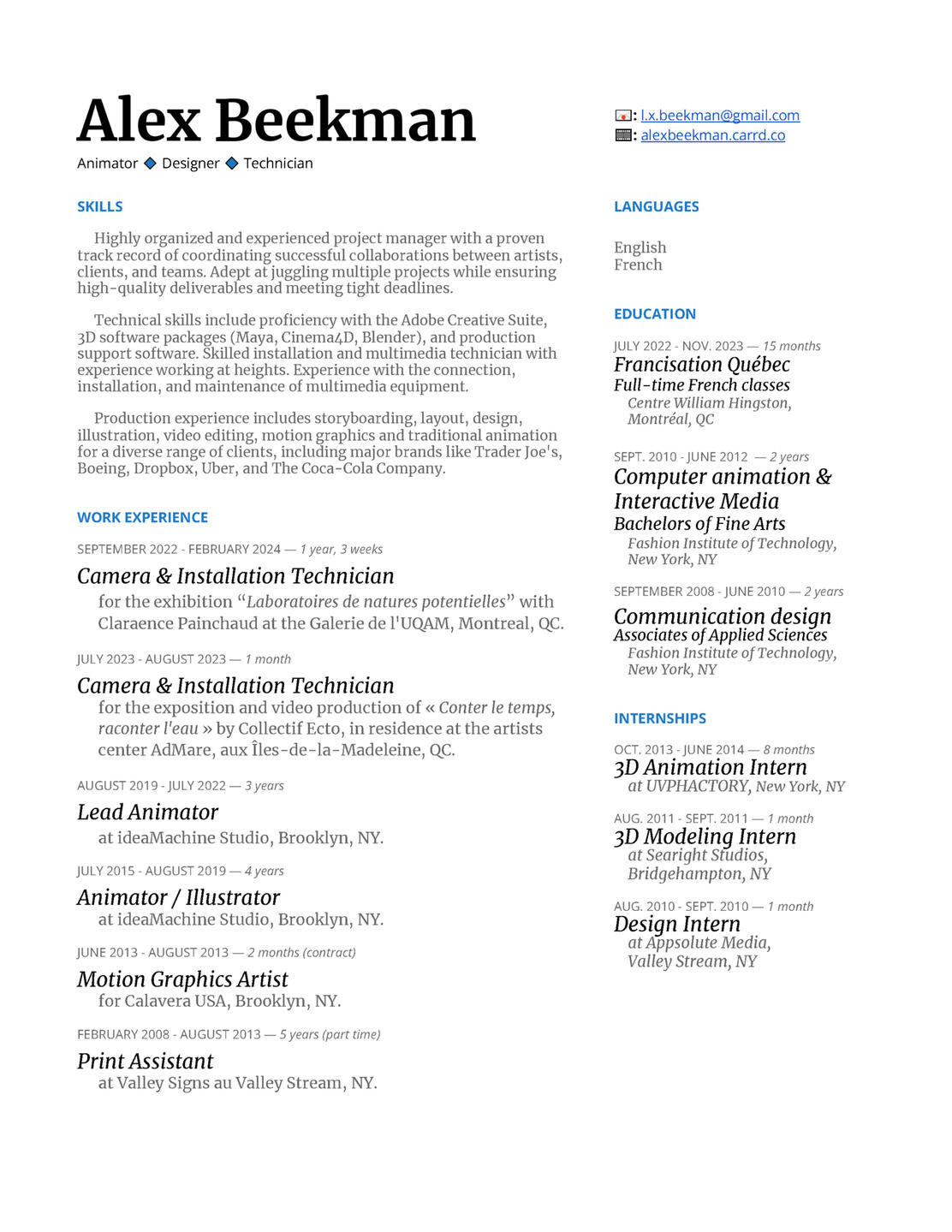 Alex was born in New York and studied animation and design at Queens College and the Fashion Institute of Technology. After graduating he worked on the award-winning short "Yearbook" and has since spent years working in motion graphics, animation & illustration in Manhattan and Brooklyn.In 2020 he relocated to Montréal and has worked as Assistant Director of Photography on the video production of visual artist Claraence Painchaud.Additionally, he provided technical support for the artist collective Ecto during their residency aux Îles-de-la-Madeleine for the artist center AdMare.He is currently working full-time as Video Editor and Motion Graphics artist chez Winifred Creative.